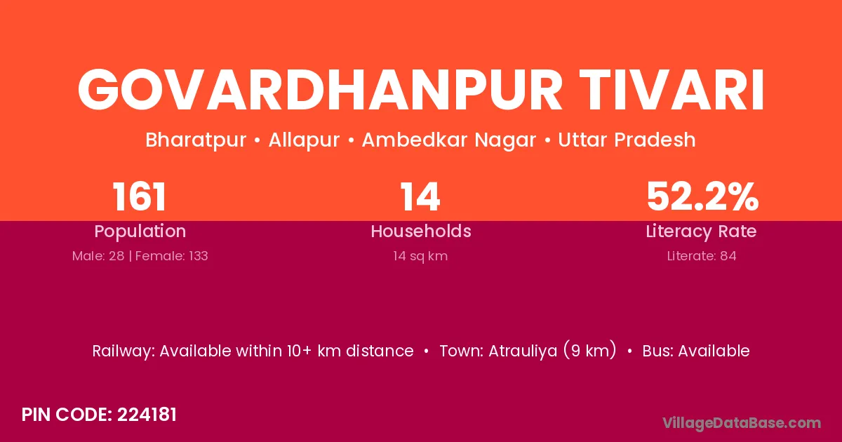 Govardhanpur Tivari village has a total population of 161 people, of which 28 are males and 133 are females.