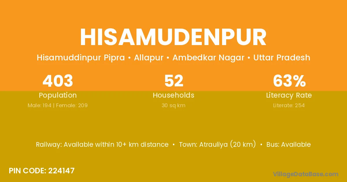 Atrauliya (20 km) is the nearest town to Hisamudenpur village for major economic activities and is located approximately 20 km away.
