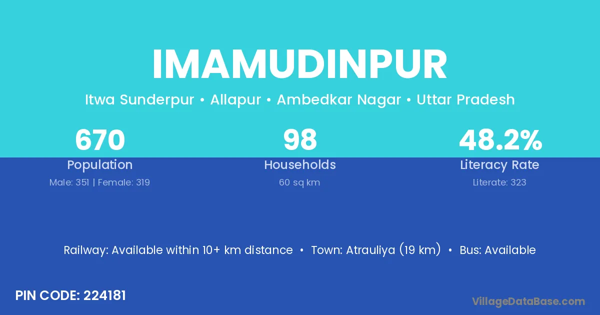 Atrauliya (19 km) is the nearest town to Imamudinpur village for major economic activities and is located approximately 19 km away.