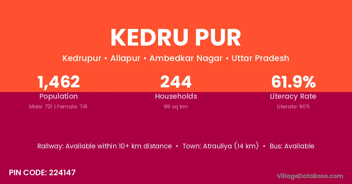 Atrauliya (14 km) is the nearest town to Kedru Pur village for major economic activities and is located approximately 14 km away.