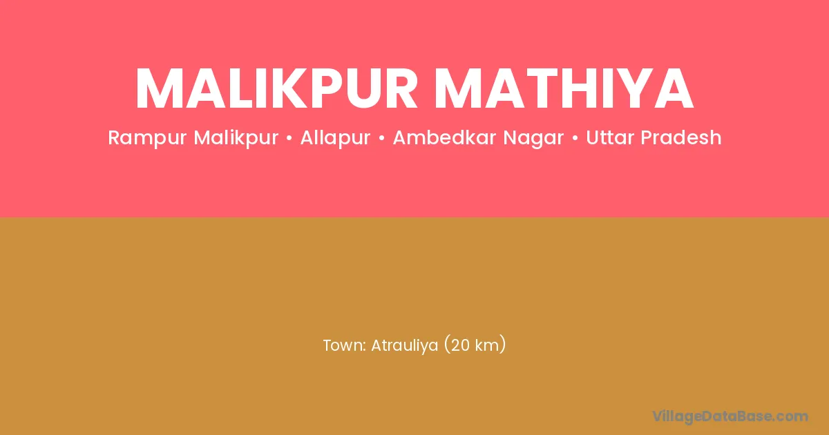 Atrauliya (20 km) is the nearest town to Malikpur Mathiya village for major economic activities and is located approximately 20 km away.