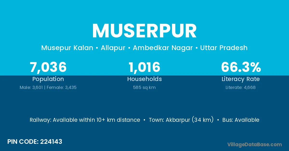 Akbarpur (34 km) is the nearest town to Muserpur village for major economic activities and is located approximately 34 km away.