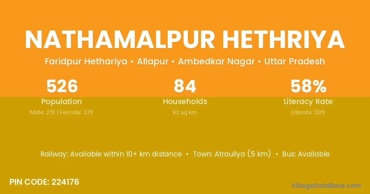Atrauliya (5 km) is the nearest town to Nathamalpur Hethriya village for major economic activities and is located approximately 5 km away.