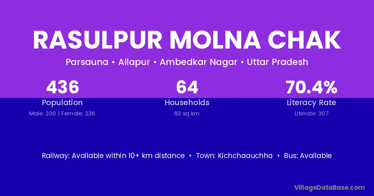 Rasulpur Molna Chak village has a total population of 436 people, of which 200 are males and 236 are females.
