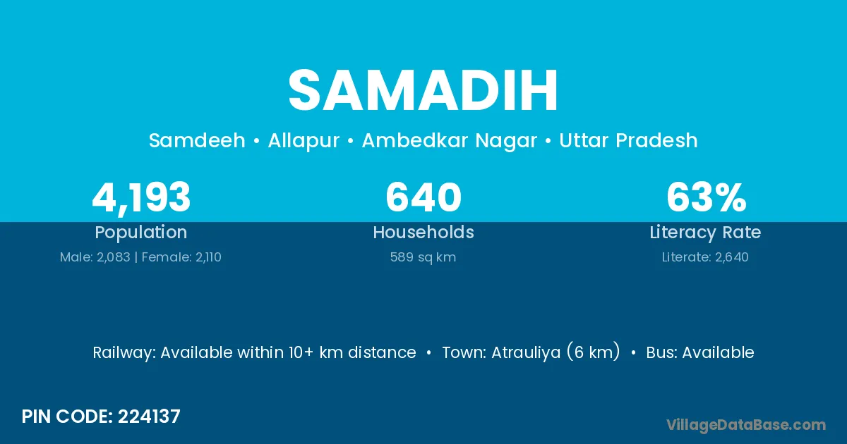 Atrauliya (6 km) is the nearest town to Samadih village for major economic activities and is located approximately 6 km away.