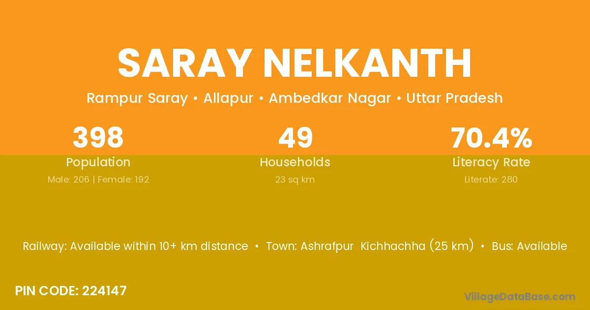 Ashrafpur Kichhachha (25 km) is the nearest town to Saray Nelkanth village for major economic activities and is located approximately 25 km away.