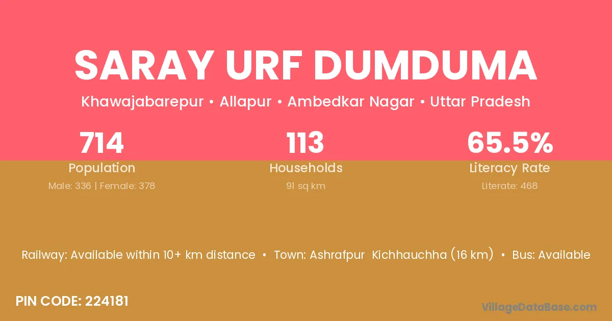 Ashrafpur Kichhauchha (16 km) is the nearest town to Saray Urf Dumduma village for major economic activities and is located approximately 16 km away.