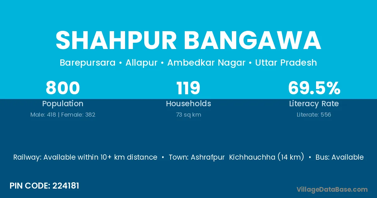 Ashrafpur Kichhauchha (14 km) is the nearest town to Shahpur Bangawa village for major economic activities and is located approximately 14 km away.