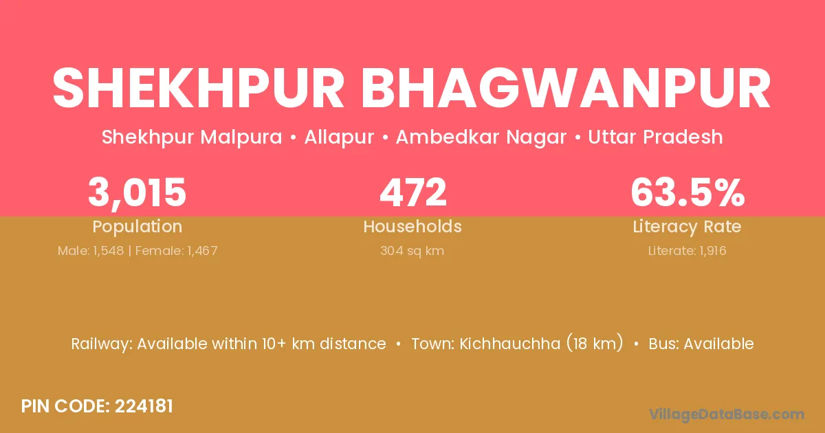 Shekhpur Bhagwanpur village has a total population of 3,015 people, of which 1,548 are males and 1,467 are females.