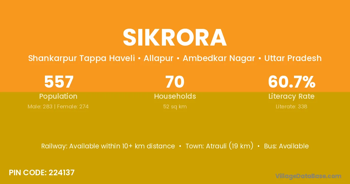 Atrauli (19 km) is the nearest town to Sikrora village for major economic activities and is located approximately 19 km away.