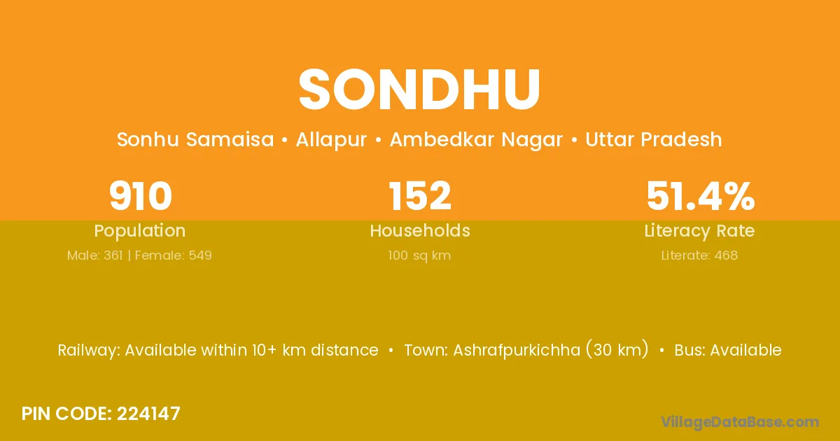 Sondhu village has a total population of 910 people, of which 361 are males and 549 are females.