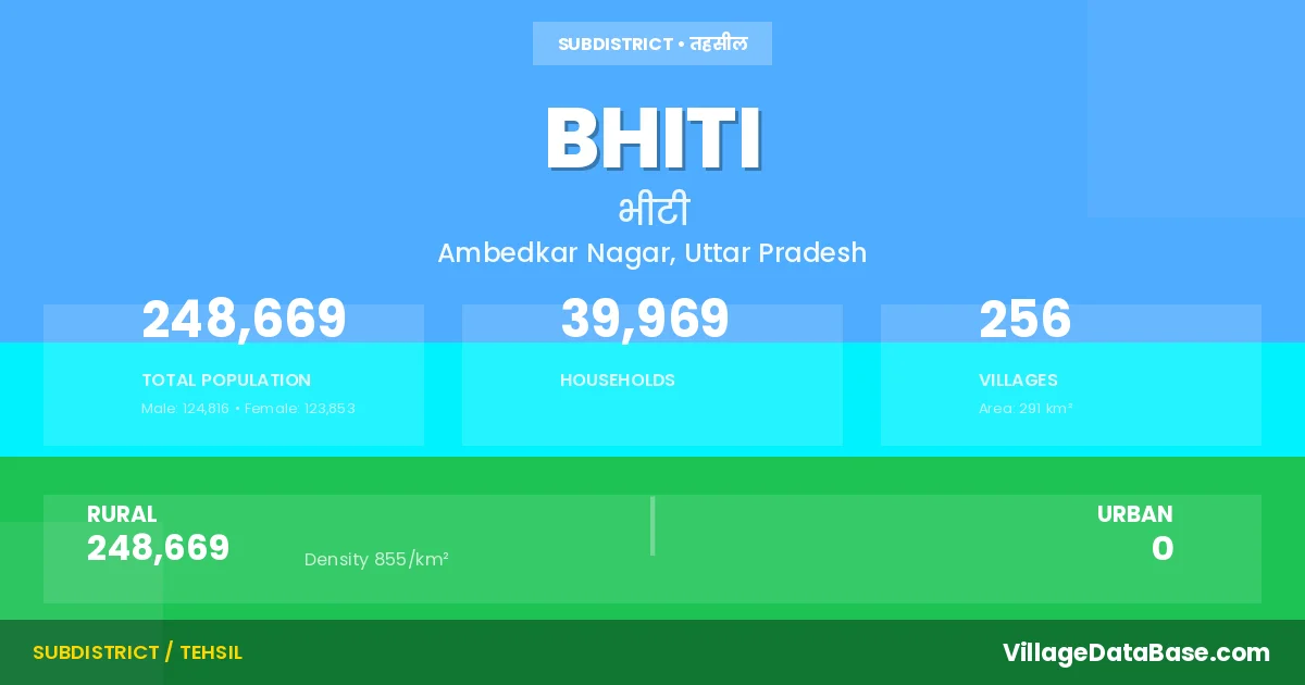 Bhiti is a town and Tehsil in the Ambedkar Nagar district of the Uttar Pradesh. In India, a Tehsil is a subdivision of a district responsible for the administration and revenue collection of a specific area within the district. Tehsils play a crucial role in the local governance structure, contributing significantly to the development and administration of their communities.