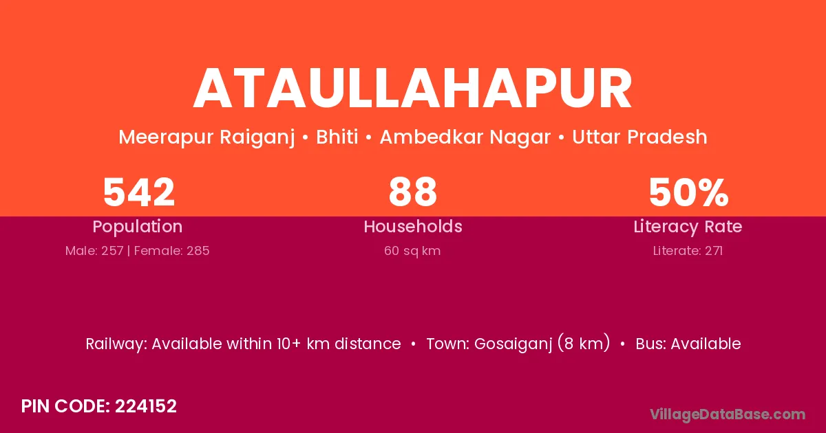Ataullahapur village has a total population of 542 people, of which 257 are males and 285 are females.