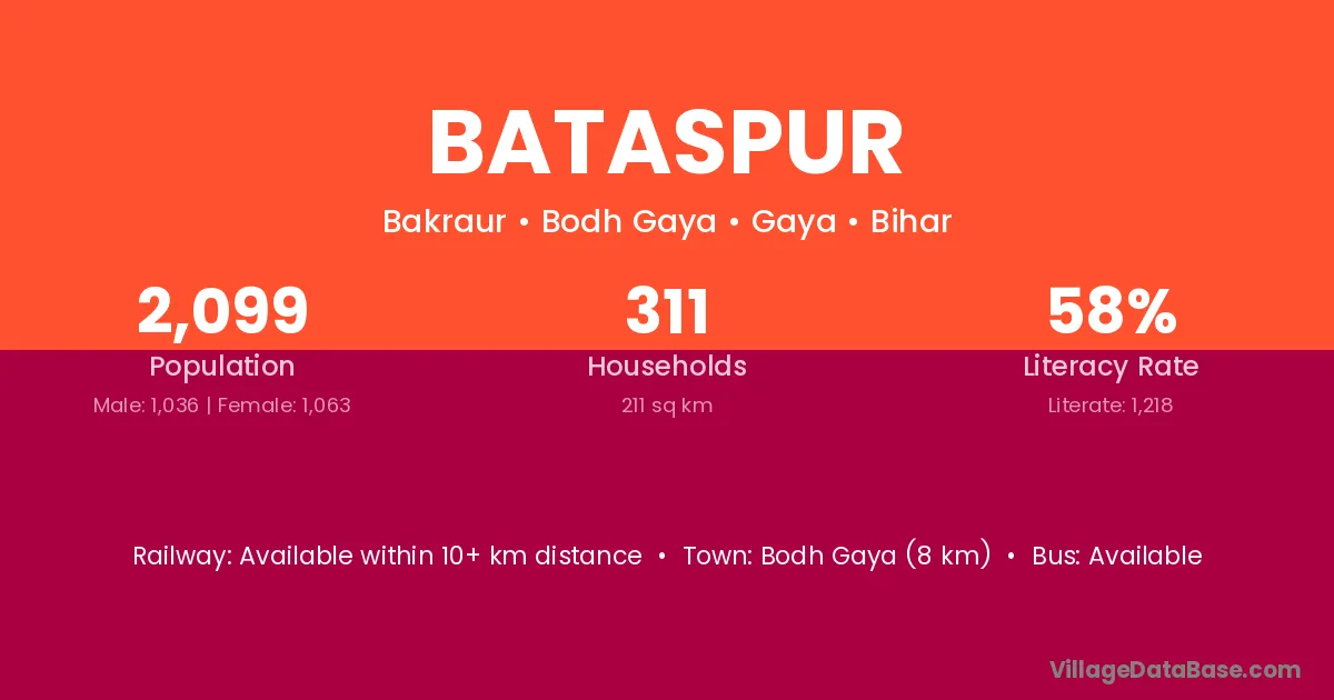 The literacy rate of Bataspur village is 49.30%. Male literacy stands at 54.86% and female literacy at 43.96%.