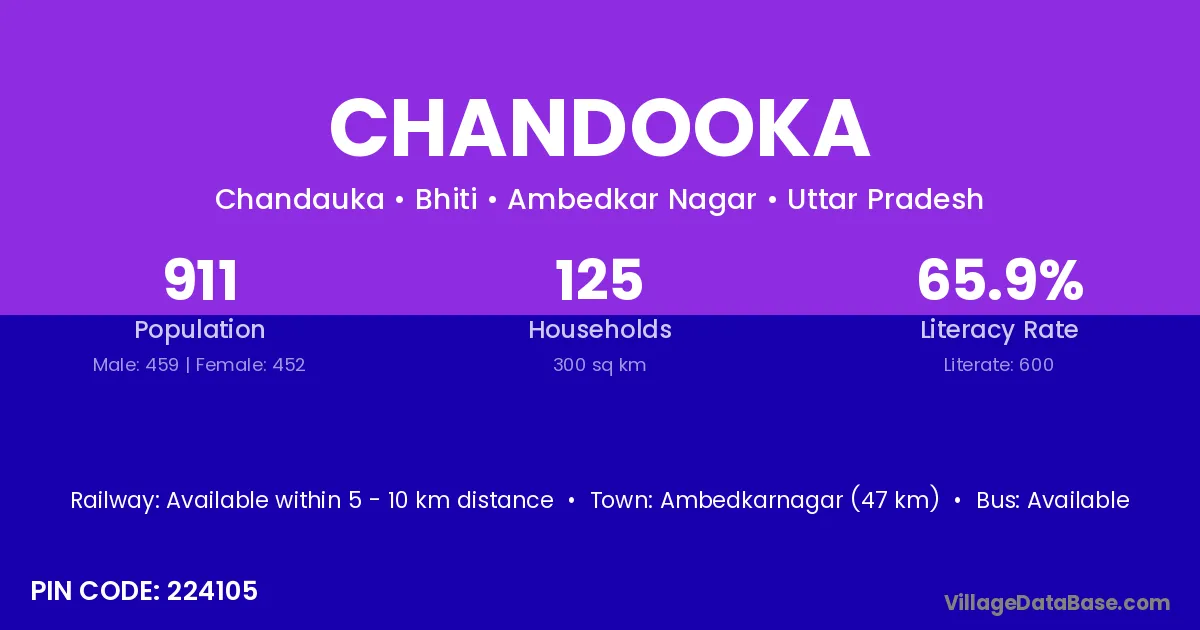 Ambedkarnagar (47 km) is the nearest town to Chandooka village for major economic activities and is located approximately 47 km away.