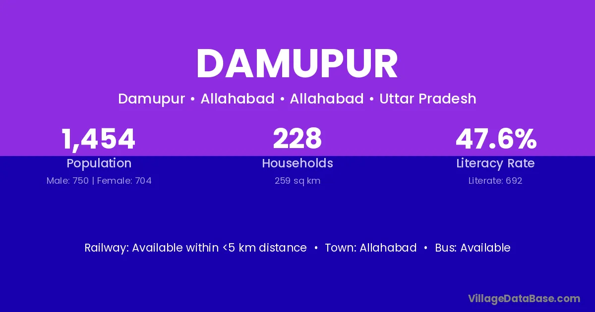 The literacy rate of Damupur village is 62.50%. Male literacy stands at 70.71% and female literacy at 52.59%.