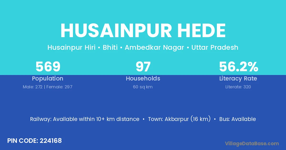 Akbarpur (16 km) is the nearest town to Husainpur Hede village for major economic activities and is located approximately 16 km away.