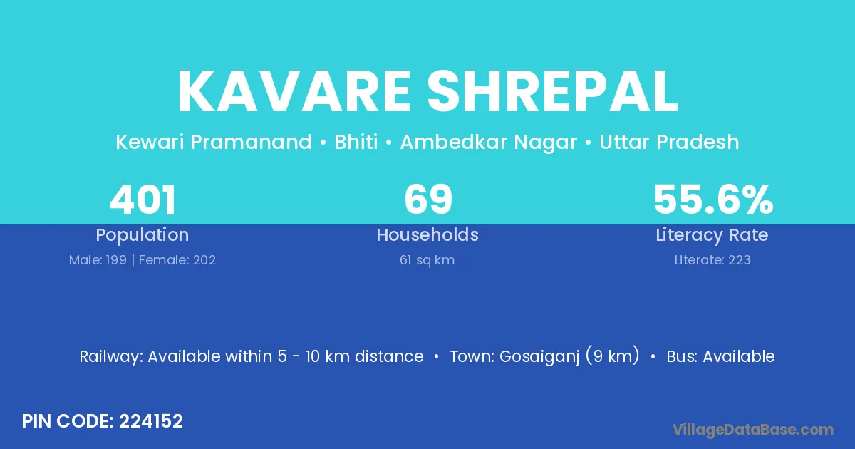 Gosaiganj (9 km) is the nearest town to Kavare Shrepal village for major economic activities and is located approximately 9 km away.