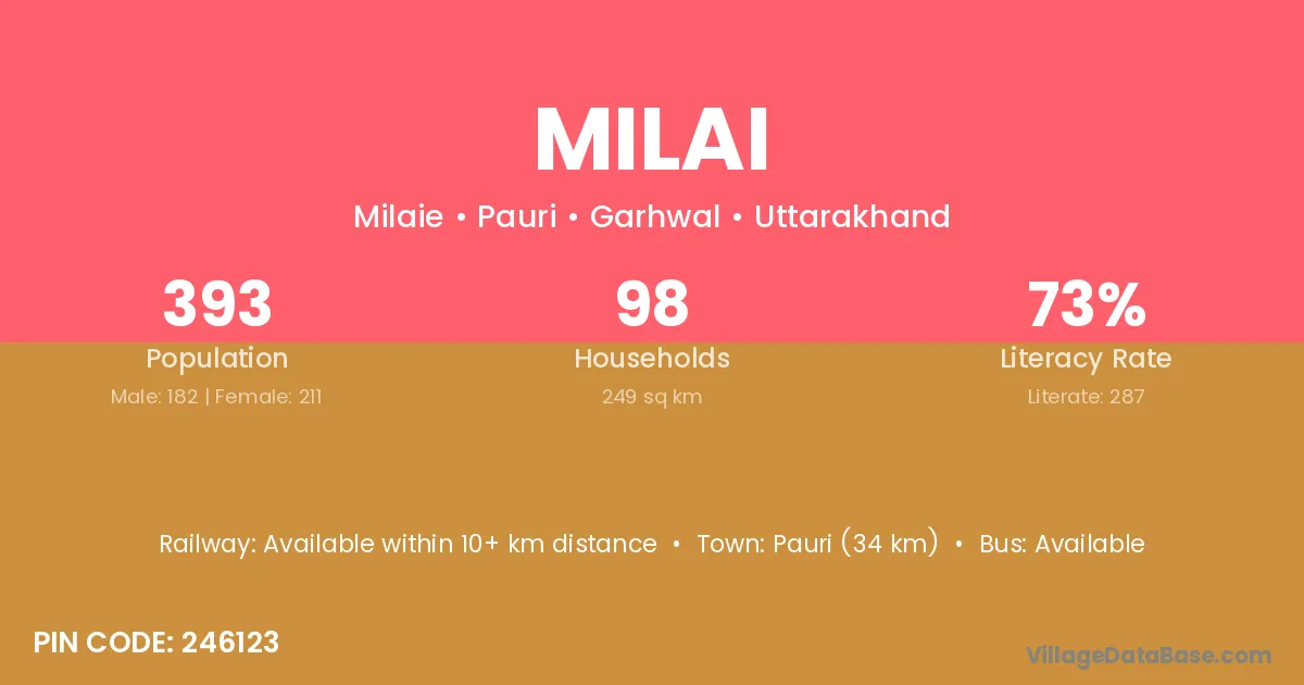 The literacy rate of Milai village is 59.05%. Male literacy stands at 73.15% and female literacy at 44.12%.