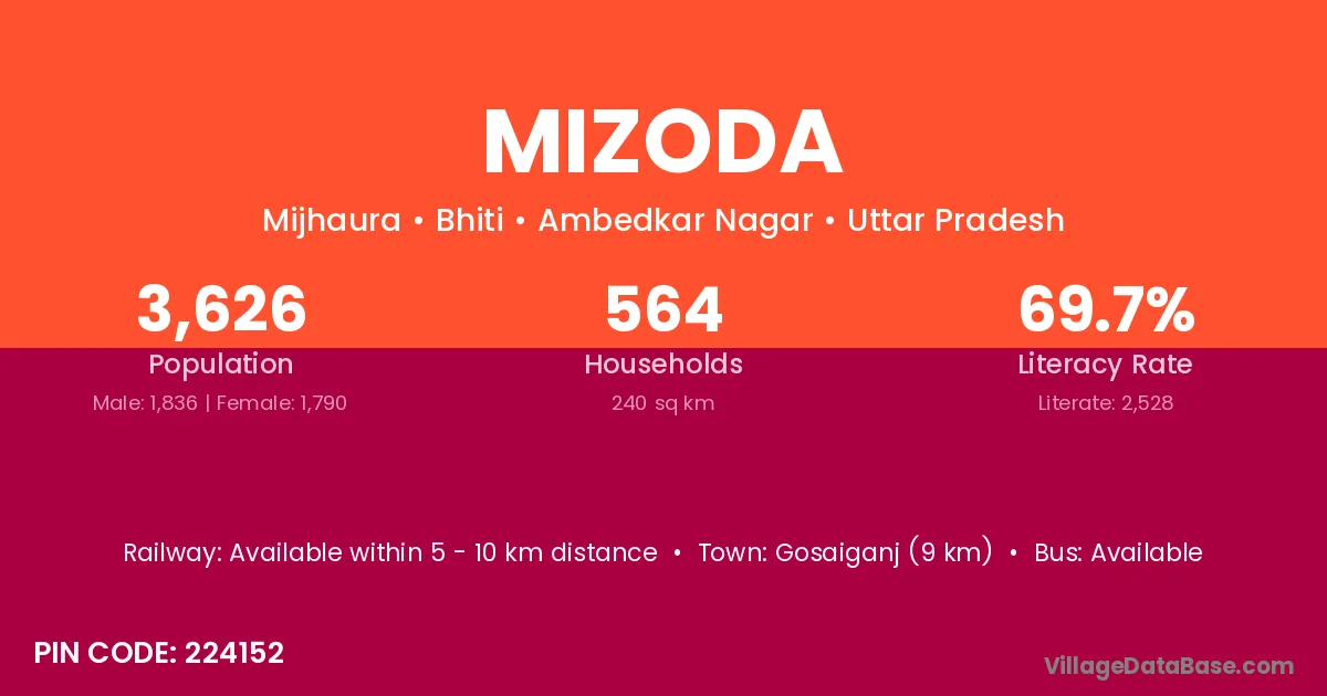 Gosaiganj (9 km) is the nearest town to Mizoda village for major economic activities and is located approximately 9 km away.