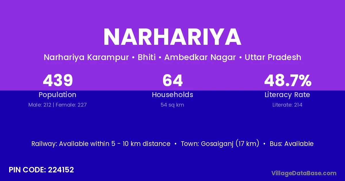Gosaiganj (17 km) is the nearest town to Narhariya village for major economic activities and is located approximately 17 km away.