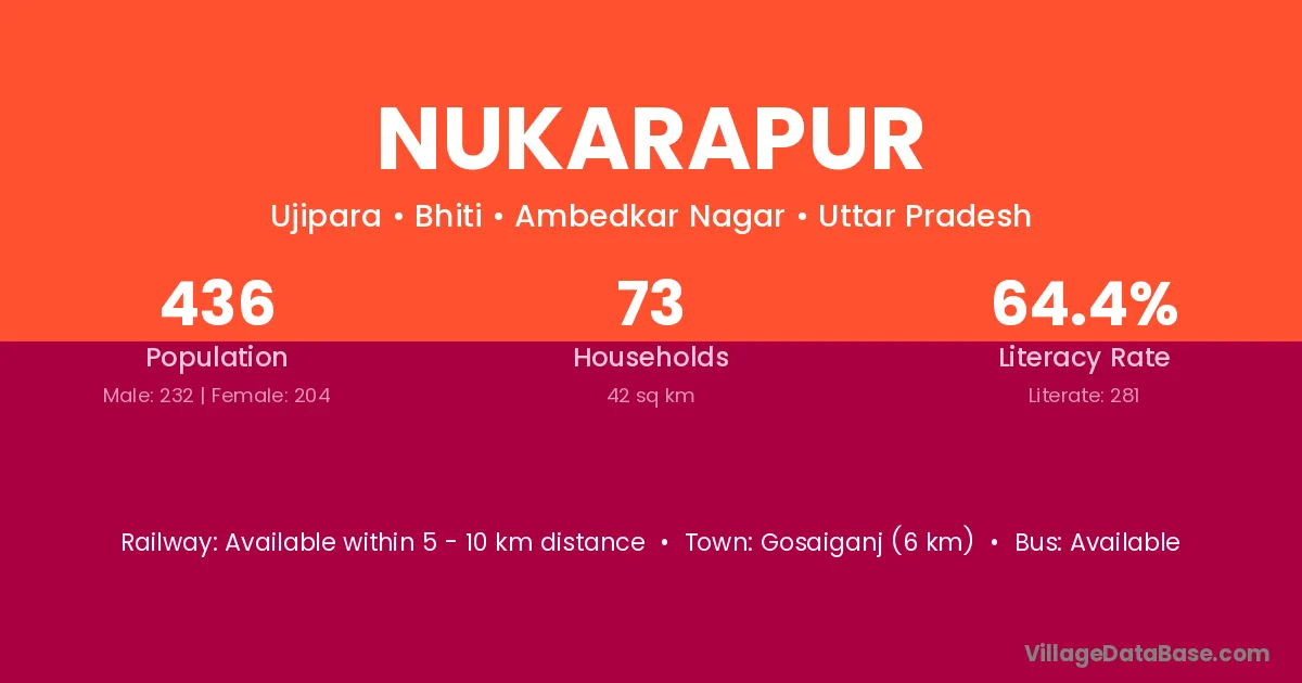 Nukarapur village has a total population of 436 people, of which 232 are males and 204 are females.