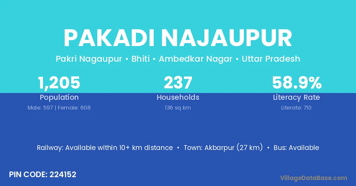 Akbarpur (27 km) is the nearest town to Pakadi Najaupur village for major economic activities and is located approximately 27 km away.