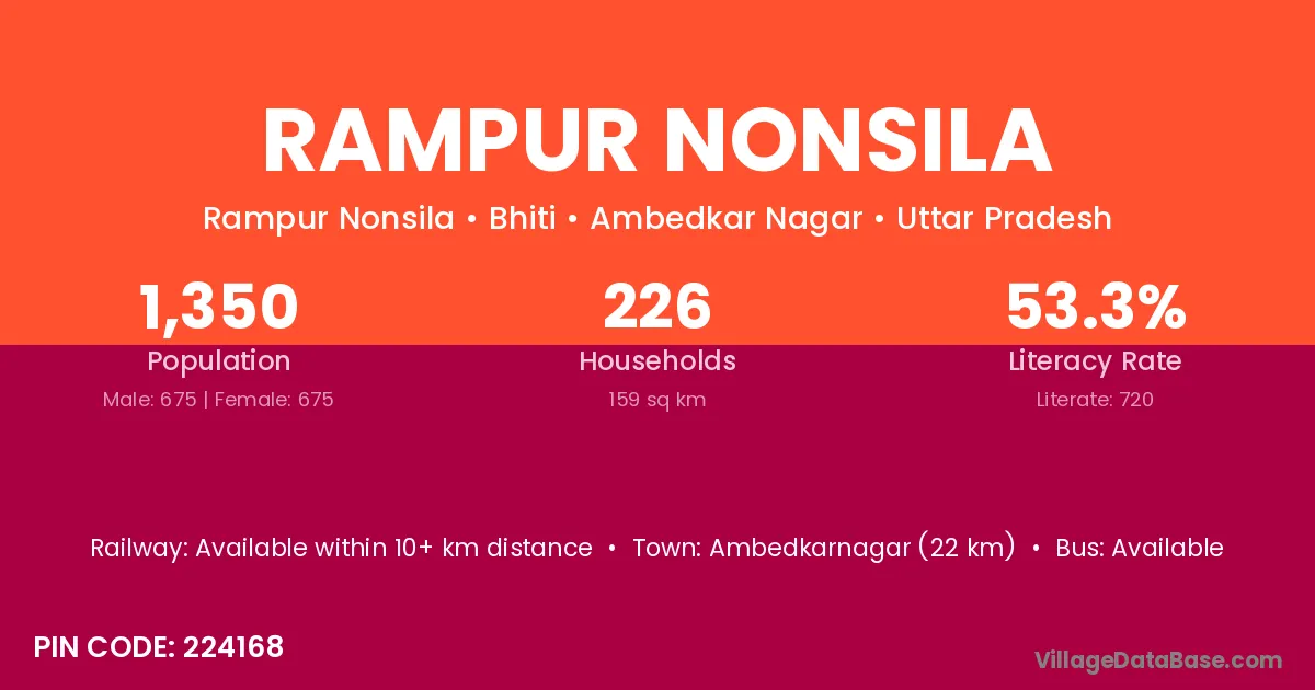 Ambedkarnagar (22 km) is the nearest town to Rampur Nonsila village for major economic activities and is located approximately 22 km away.