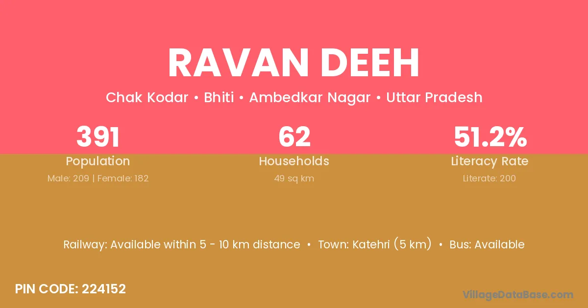 Katehri (5 km) is the nearest town to Ravan Deeh village for major economic activities and is located approximately 5 km away.