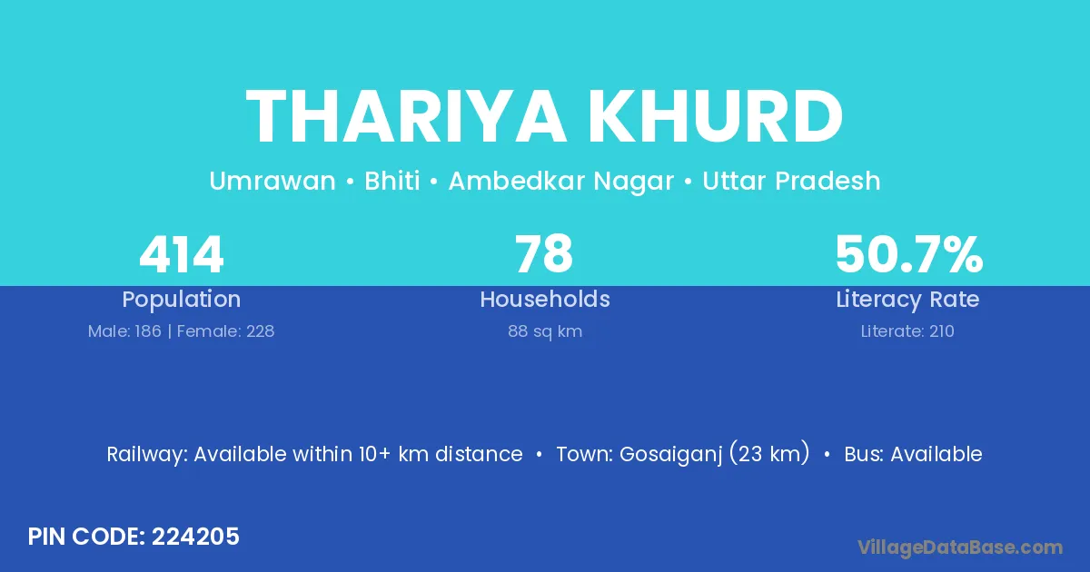 Gosaiganj (23 km) is the nearest town to Thariya Khurd village for major economic activities and is located approximately 23 km away.