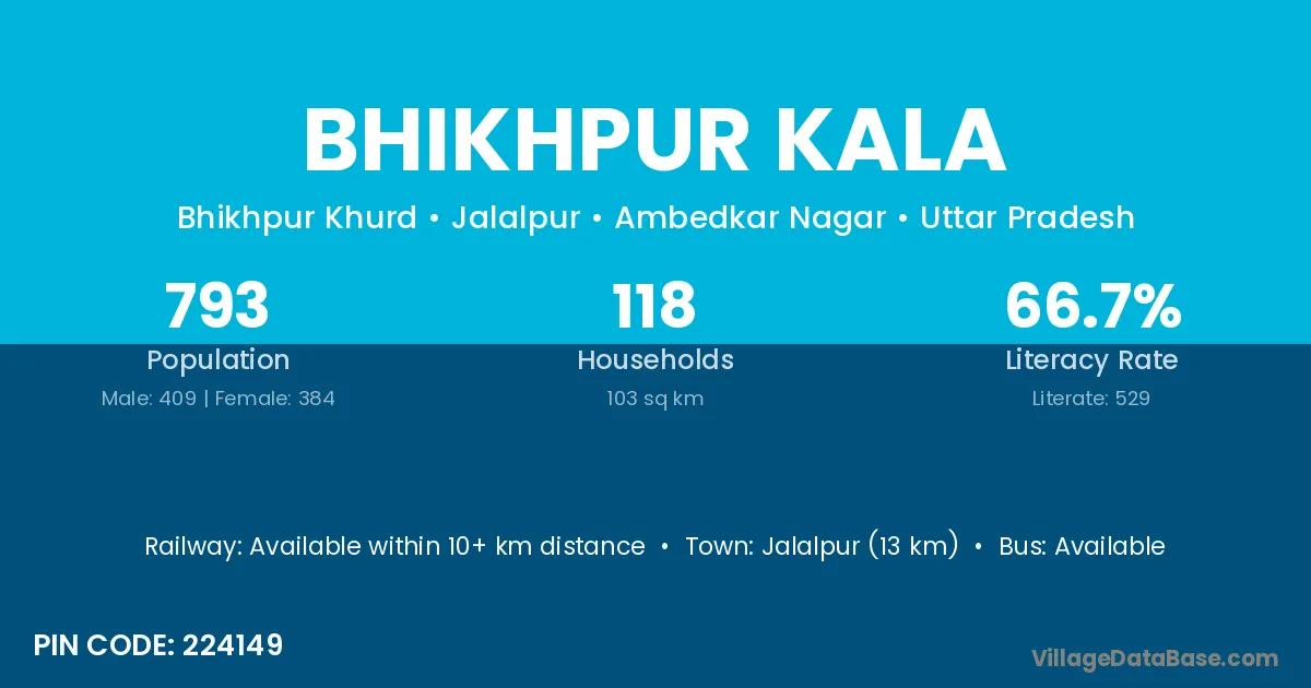 Jalalpur (13 km) is the nearest town to Bhikhpur Kala village for major economic activities and is located approximately 13 km away.