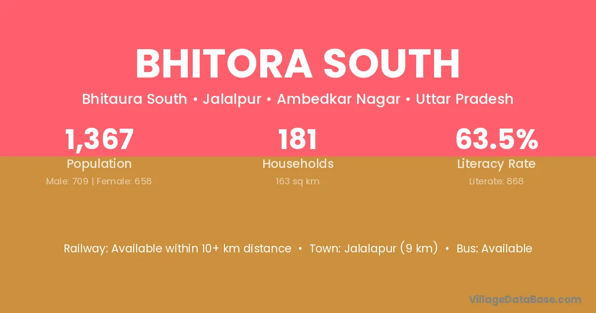 Bhitora South village has a total population of 1,367 people, of which 709 are males and 658 are females.