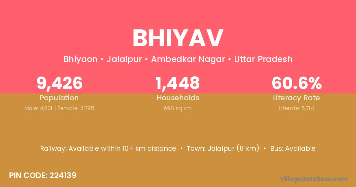 Jalalpur (8 km) is the nearest town to Bhiyav village for major economic activities and is located approximately 8 km away.