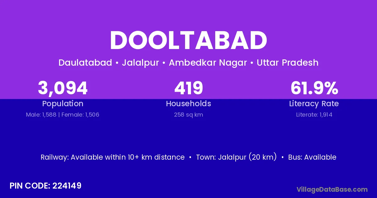 Jalalpur (20 km) is the nearest town to Dooltabad village for major economic activities and is located approximately 20 km away.