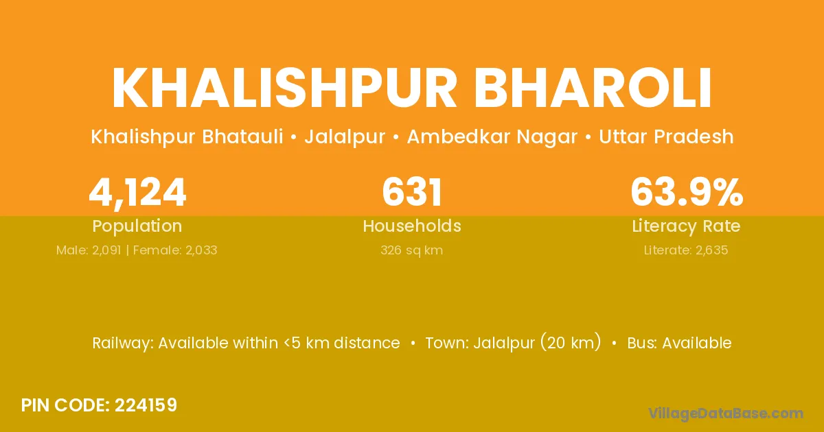 Jalalpur (20 km) is the nearest town to Khalishpur Bharoli village for major economic activities and is located approximately 20 km away.