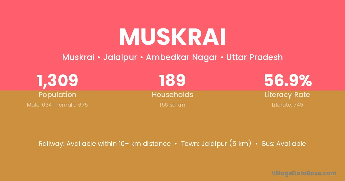 Jalalpur (5 km) is the nearest town to Muskrai village for major economic activities and is located approximately 5 km away.