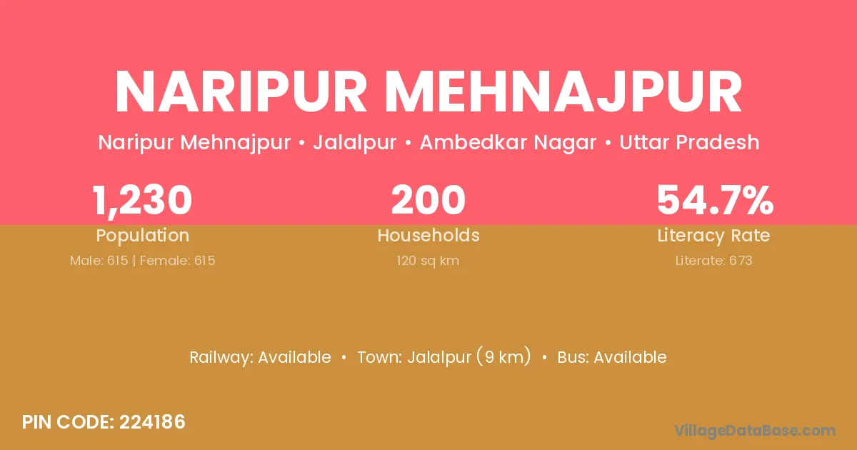 Naripur Mehnajpur village has a total population of 1,230 people, of which 615 are males and 615 are females.