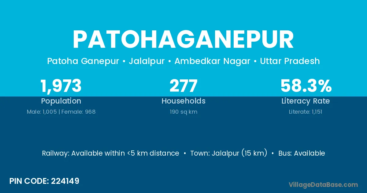 Jalalpur (15 km) is the nearest town to Patohaganepur village for major economic activities and is located approximately 15 km away.