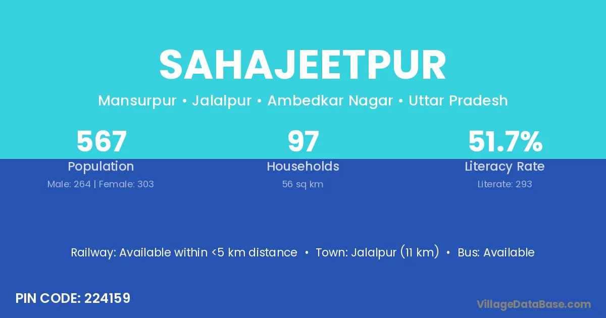 Jalalpur (11 km) is the nearest town to Sahajeetpur village for major economic activities and is located approximately 11 km away.