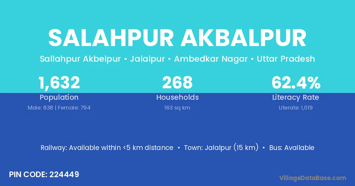 Salahpur Akbalpur village has a total population of 1,632 people, of which 838 are males and 794 are females.
