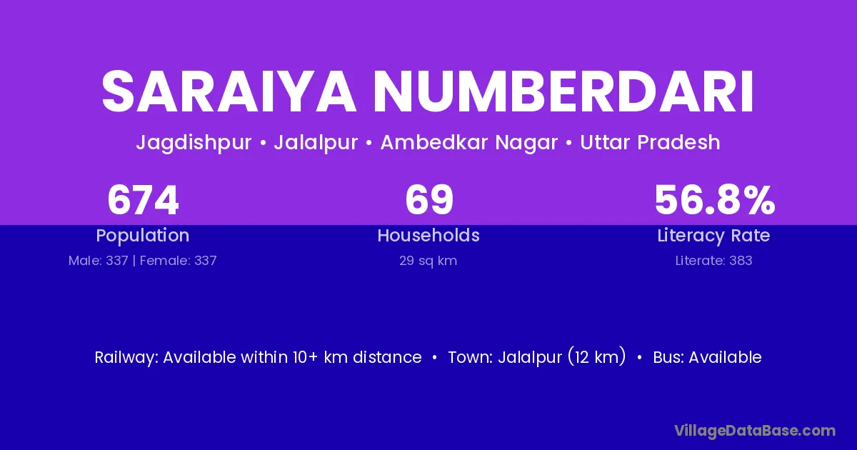 Jalalpur (12 km) is the nearest town to Saraiya Numberdari village for major economic activities and is located approximately 12 km away.