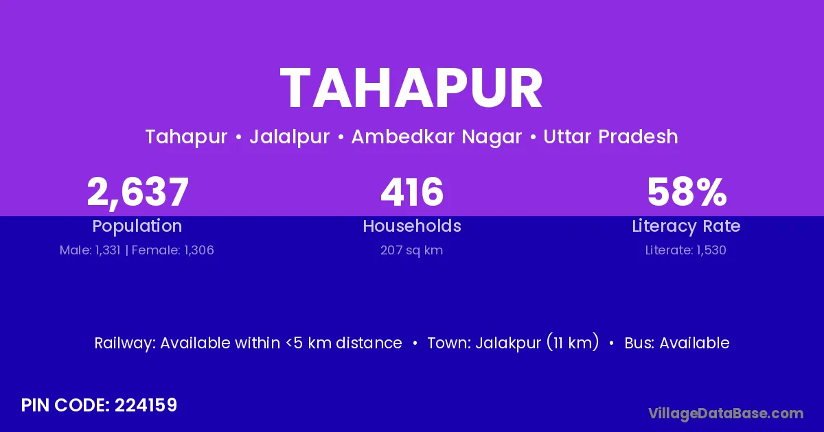 Jalakpur (11 km) is the nearest town to Tahapur village for major economic activities and is located approximately 11 km away.