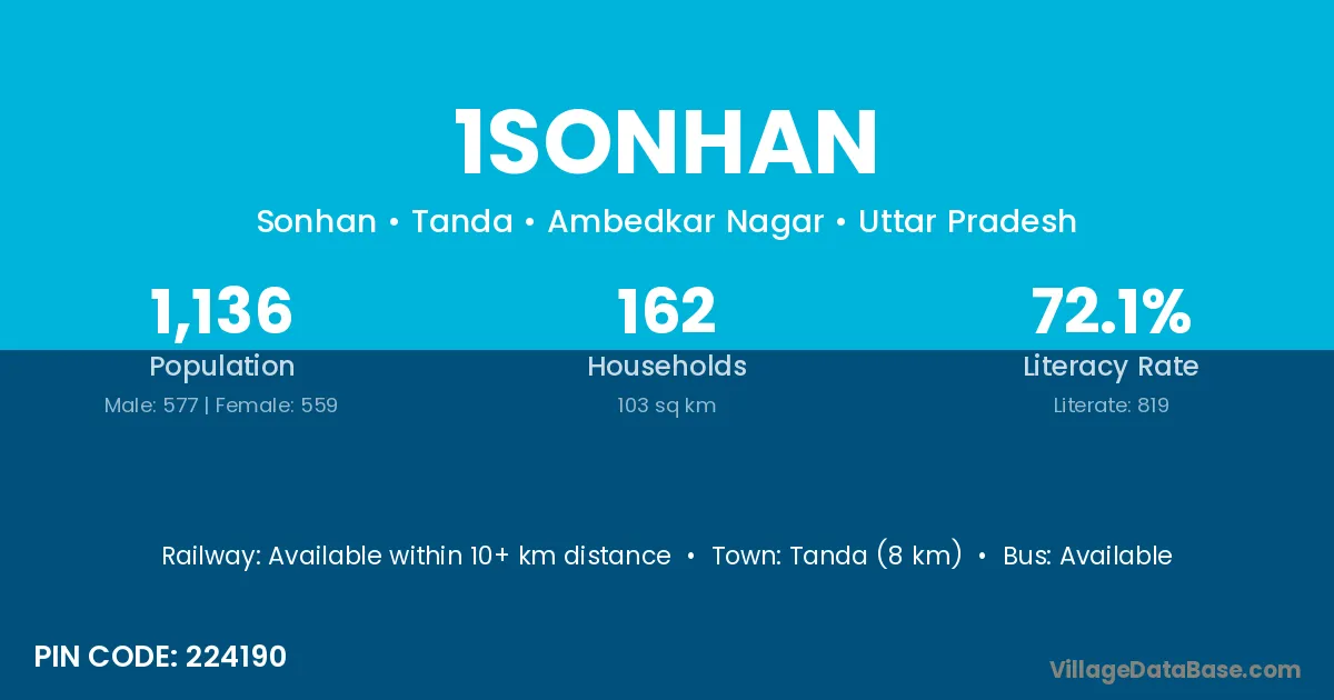 Tanda (8 km) is the nearest town to 1sonhan village for major economic activities and is located approximately 8 km away.