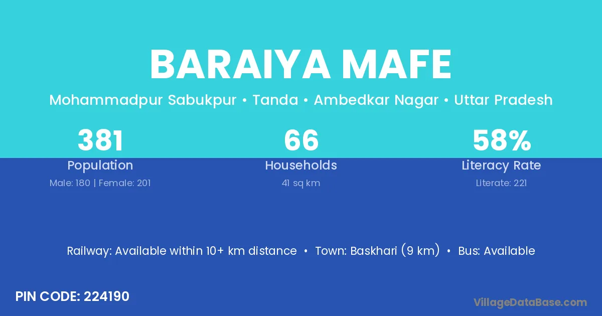 Baskhari (9 km) is the nearest town to Baraiya Mafe village for major economic activities and is located approximately 9 km away.