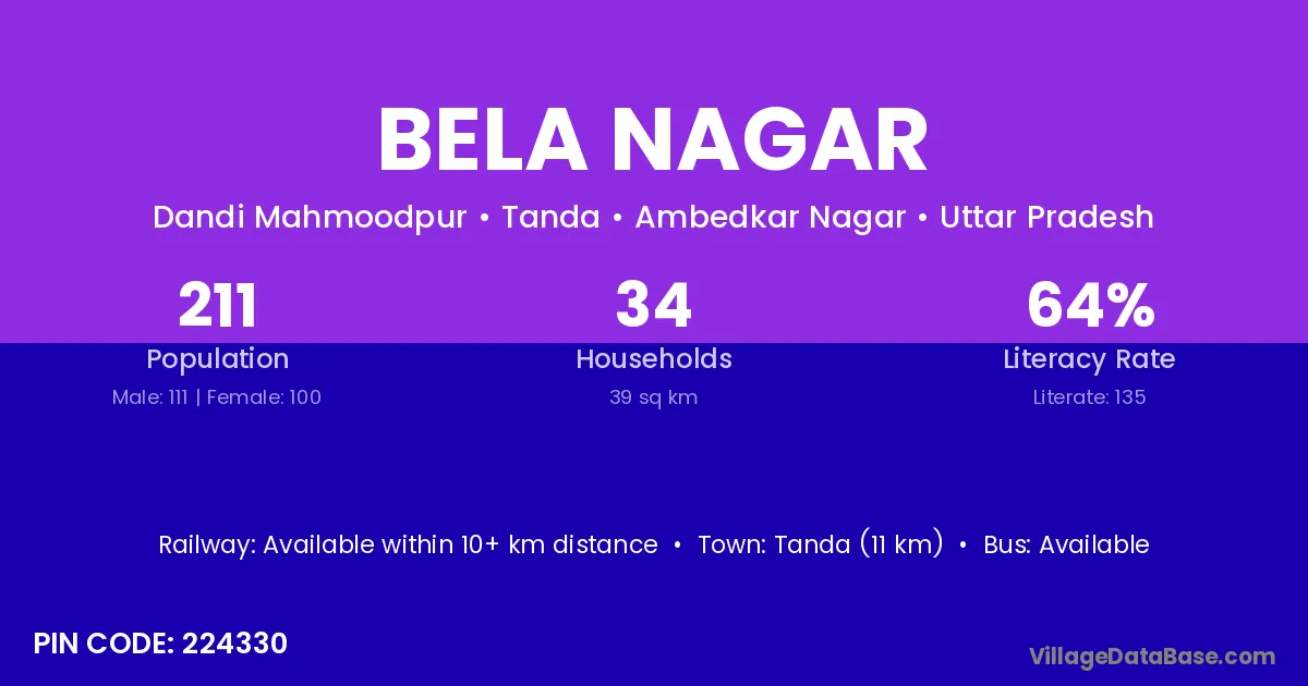 Tanda (11 km) is the nearest town to Bela Nagar village for major economic activities and is located approximately 11 km away.