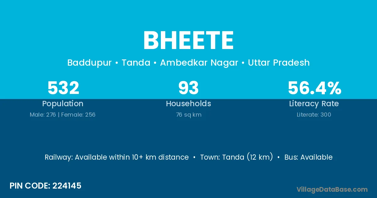 Tanda (12 km) is the nearest town to Bheete village for major economic activities and is located approximately 12 km away.