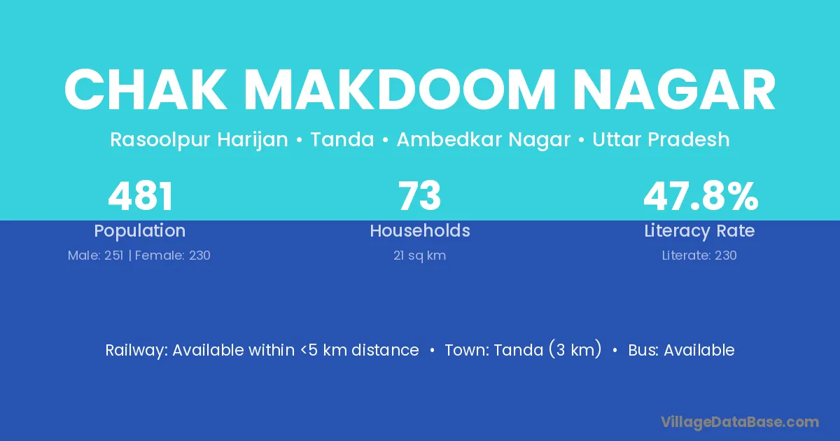 Tanda (3 km) is the nearest town to Chak Makdoom Nagar village for major economic activities and is located approximately 3 km away.