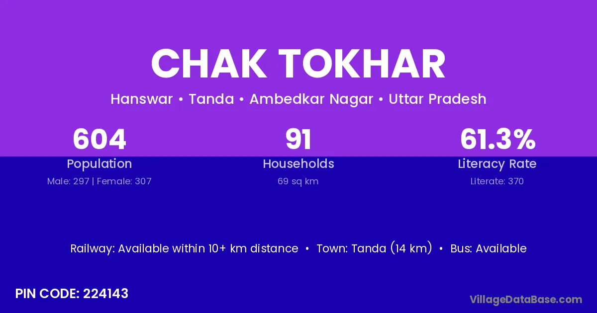 Tanda (14 km) is the nearest town to Chak Tokhar village for major economic activities and is located approximately 14 km away.