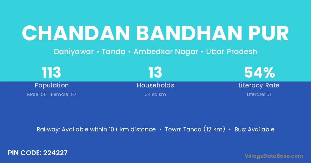 Chandan Bandhan Pur village has a total population of 113 people, of which 56 are males and 57 are females.