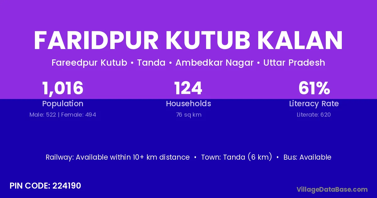 Tanda (6 km) is the nearest town to Faridpur Kutub Kalan village for major economic activities and is located approximately 6 km away.